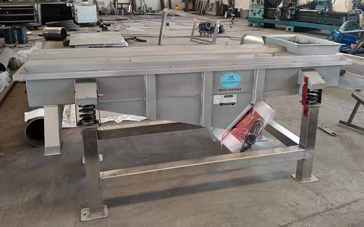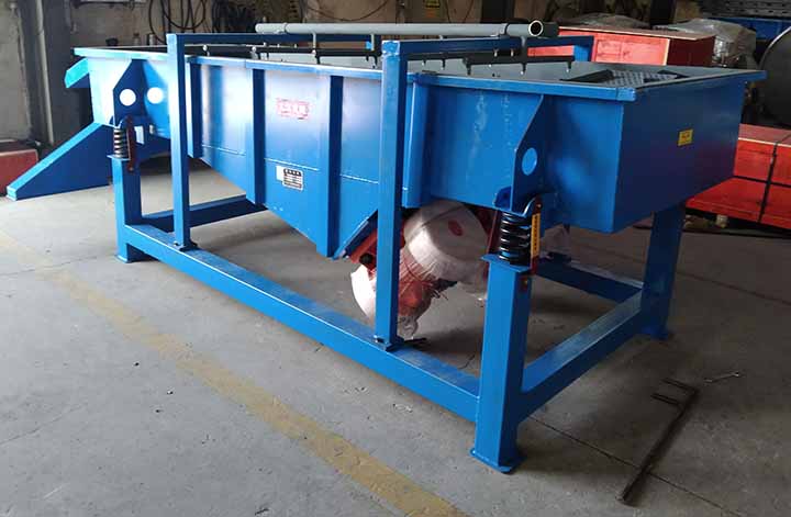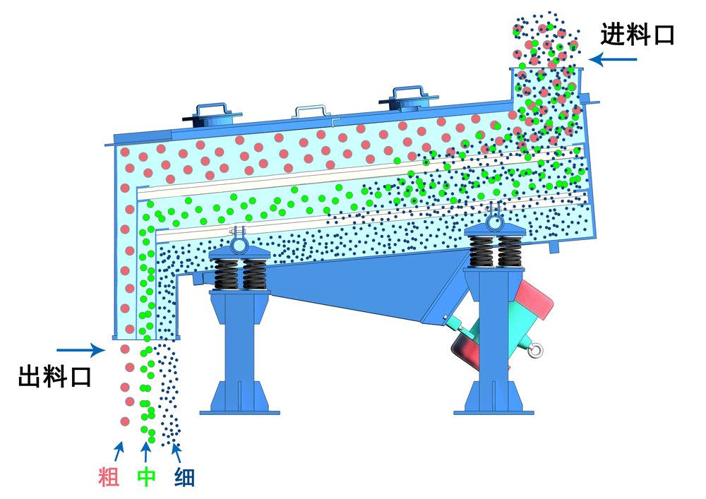 亮粉分級直線篩以振動電機產生的激振力為動力,核心通過振動傳遞和多層篩網分離來實現分級。運行時,振動電機帶動篩箱直線往復振動,使亮粉隨振動向前運動,而從上到下孔徑遞減的多層篩網會對亮粉按顆粒大小分離:大顆粒的亮粉無法通過上層篩網,排出為粗級產物;中等顆粒通過上層篩網后被中層篩網截留,成為中級產物;小顆粒穿透所有篩網,形成細級產物,最終完成亮粉分級。